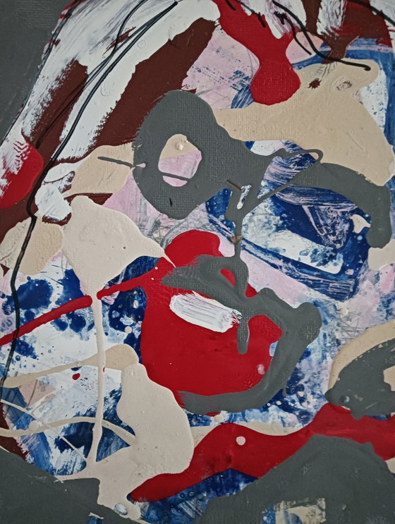 Scopri la forza espressiva di questo dipinto astratto, intitolato "Famous Rockstar". Quest'opera cattura l'energia e il dinamismo di un'icona del rock con un vibrante mix di colori e forme. La combinazione di tonalità di rosso, blu, grigio e beige crea uno spettacolo visivo che cattura l'attenzione e stimola l'immaginazione.