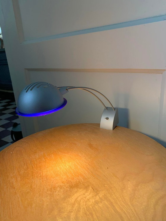 Faretto da parete IKEA Gruva dei primi anni 2000, in argento con dettagli blu trasparente.