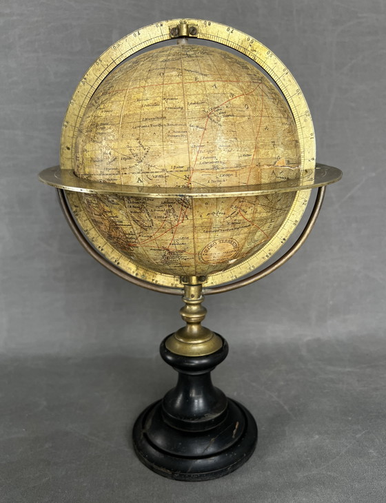 Faustino Paluzie, Globo di fine XIX secolo. Globo in stucco con litografia. Stucco, bronzo e legno. Altezza totale 35 cm. Diametro del meridiano esterno 21,7 cm. Aree con litografia mancante e alcune crepe.