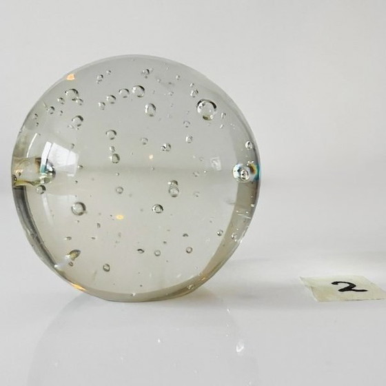 Fermacarte sferico vintage in cristallo trasparente con piccole bolle d'aria e diametro di 6 cm.