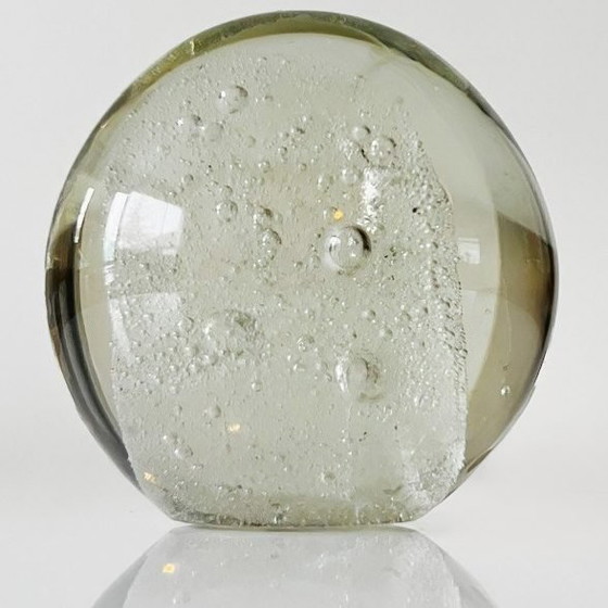 Fermacarte vintage in vetro di Murano, cristallo trasparente, con scultura a forma di bolla, degli anni '80. Questo fermacarte ha un diametro di 5 cm.