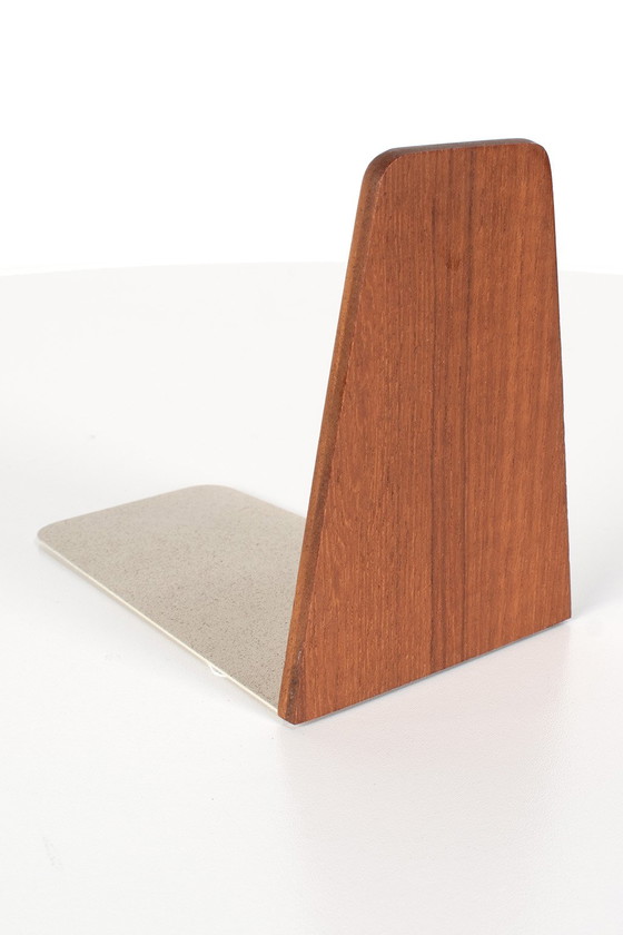 Fermalibri di Kai Kristiansen in acciaio e teak. Less is more, un progetto di uno dei più famosi designer della metà del secolo scorso. Disponiamo di tre fermalibri separati. Sono tutti realizzati in teak, ma naturalmente con venature diverse. Il prezzo si intende per pezzo. In buone condizioni vintage.