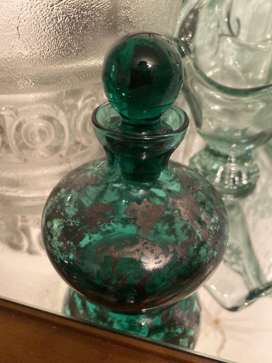 Questo squisito flacone in vetro di Murano è una testimonianza dell'abilità dei maestri vetrai veneziani. La sua tonalità smeraldo, accentuata da delicati tocchi di oro rosa, cattura la luce in una danza ipnotica di colori e brillantezza.