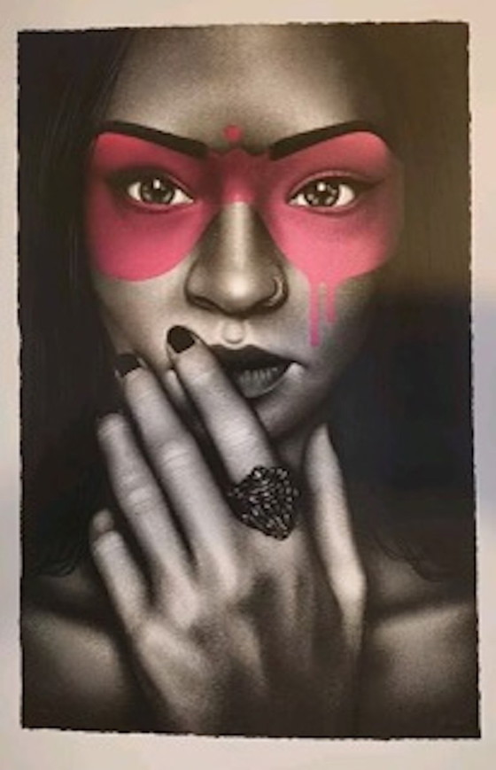 In vendita una versione esclusiva dell'ambita serie Haiconca di FIN DAC: Haiconca (Pink) del 2023. Questo ritratto potente ed espressivo è un esempio eccezionale dell'estetica urbana di FIN DAC, con mascherature iconiche e delicati effetti di lacca e stratificazione che rendono l'immagine vibrante e unica.