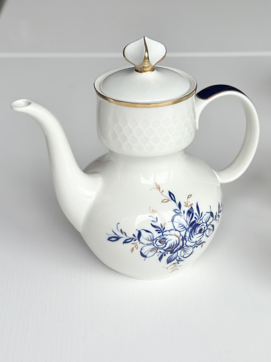 Servizio da tè in porcellana pregiata della Germania dell'Est - 22 pezzi, blu e oro, a pareti sottili