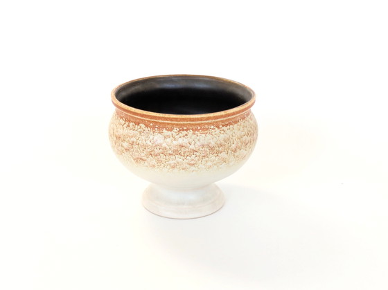 Vaso con piedistallo in ceramica vintage degli anni '60 di VEB Haldensleben, Germania orientale, con una smaltatura satinata nei toni caldi del beige e del marrone ruggine all'esterno e un marrone cioccolato fondente all'interno. Con la sua elegante base a piedistallo, questo vaso è sia funzionale che decorativo, perfetto per piante da interno, piante grasse o come pezzo forte su una mensola o un tavolo. Una fantastica aggiunta a qualsiasi interno MCM, retrò o eclettico, questo pezzo in ceramica della Germania orientale incarna l'artigianato e lo stile dell'epoca. Dimensioni: Altezza: 12,8 cm Diametro: 16 cm Condizioni: Eccellenti condizioni vintage con minimi segni di usura all'interno (vedi foto per i dettagli). Marchio del produttore e numero di modello 8130 visibili sotto.