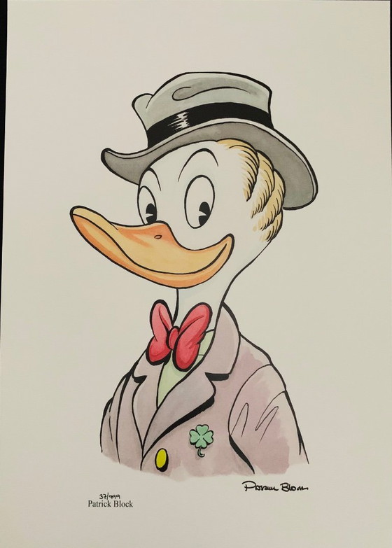 Firmato e numerato a mano da Patrick Block: "Gladstone Gander nel suo abito preferito". Edizione limitata di 999 copie, stampa offset verticale. Qui n. 37/999. Pubblicato in un'unica edizione. Patrick Block (nato nel 1958) ha scritto più di 90 storie per Donald Duck Adventures ecc. insieme a sua moglie Shelly. Patrick ha anche disegnato storie e copertine ecc. per le riviste di Donald Duck e altre pubblicazioni Disney in tutto il mondo, e le sue storie sono state tradotte in più di 36 lingue. Nel periodo 1996-1998 Patrick ha lavorato a stretto contatto con Carl Barks alla creazione della storia "Somewhere In Nowhere" e di diverse battute e bozze per i disegni, che possono essere visti nel libro "The Carl Barks Treasury", tra gli altri. Oltre alla produzione di storie e copertine e al lavoro freelance per il Walt Disney Group, Patrick ha dedicato le sue eccezionali capacità artistiche agli acquerelli e ai dipinti a olio, continuando l'orgogliosa tradizione di Carl Barks di creare arte Disney di altissima qualità. Il successo è stato enorme e i dipinti a olio di Patrick hanno già raggiunto prezzi al dettaglio ben superiori ai 15.000 dollari. L'opera non è mai stata incorniciata ed è conservata in una scatola d'archivio scura, avvolta in carta protettiva priva di acidi. Le foto mostrate fanno parte della descrizione. Quest'opera d'arte sarà accuratamente imballata e spedita in carta protettiva priva di acidi. Per qualsiasi domanda, si prega di contattare Daniel inviando un messaggio.
