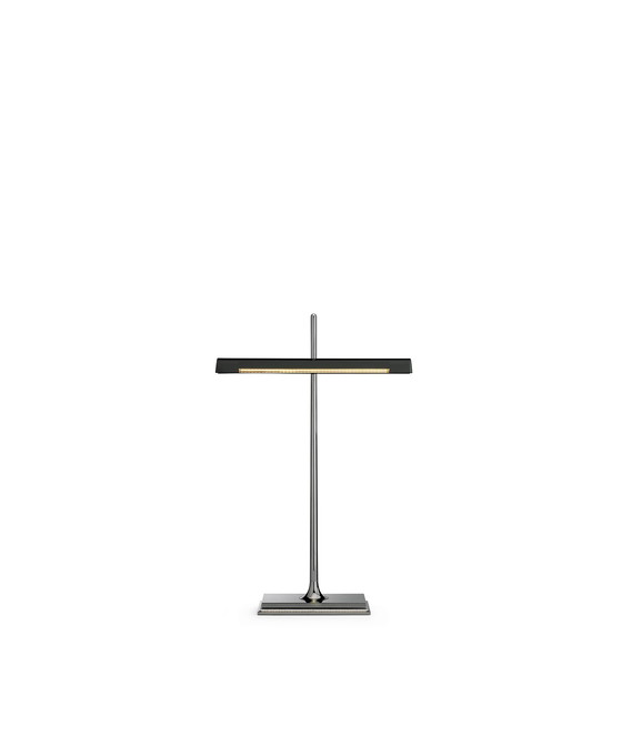 Lampada da tavolo a luce diretta. Struttura in alluminio con diffusore esterno in metacrilato trasparente e diffusore LED in PC opalino. Sensore ottico di accensione sulla base che consente la dimmerazione a 3 step. Una presa USB sul retro della base consente di ricaricare i più comuni smartphone e tablet (max 1,5A). Adattatore su spina con spine intercambiabili. Cavo di alimentazione lungo 2,5 metri