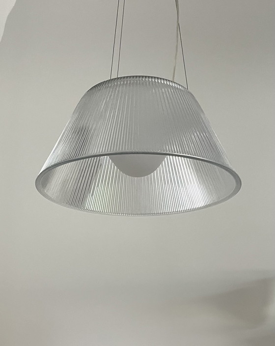 Bellissima lampada a sospensione dal design classico di Flos, Romeo Moon Suspension 2. Si tratta di una bella lampada di grandi dimensioni, con vetro spesso a coste e vetro opalino all'interno. L'ultima foto è dell'interno del paralume, per dimostrare che si tratta di una vera Flos. La lampada è ancora completamente buona. La calotta del soffitto è diventata un po' gialla, ma è possibile ordinarla separatamente nuova su Internet per 8 euro.