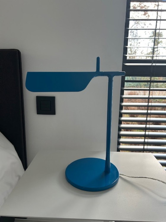 Tab T è un progetto di Edward Barber e Jay Osgerby Luto per Flos del 2011. Questa lampada da tavolo o da scrivania è nuova, ancora nella sua confezione originale, e ha un attacco G9, che le consente di essere utilizzata con sorgenti luminose sia a LED che alogene di varie potenze. La lampada presenta un esclusivo colore blu brillante, non disponibile da anni. Il design minimalista presenta una base rotonda, uno stelo elegante e un elegante diffusore rotante che scherma la sorgente luminosa, il tutto realizzato in alluminio. La lampada è larga 18 cm, profonda 27 cm e alta 33 cm ed è, ovviamente, in perfette condizioni. Sono disponibili due unità. Il prezzo unitario è indicato.