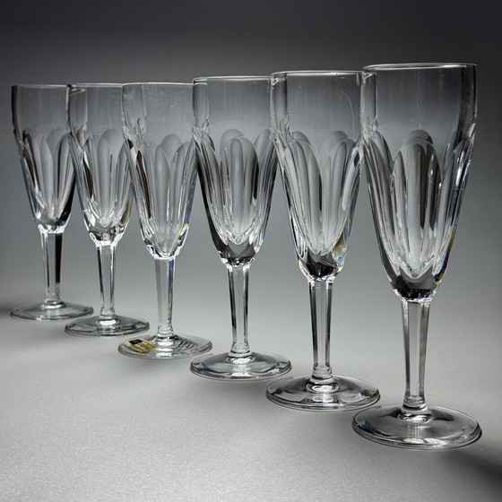 Un raffinato set di flûte da champagne in cristallo vintage di Barthmann, realizzate con un'eccezionale attenzione ai dettagli. Ogni bicchiere presenta un'incisione tagliata a mano, che crea un elegante motivo allungato che cattura e riflette magnificamente la luce. La trasparenza e la brillantezza del cristallo mettono in risalto la maestria artigianale tipica della raffinata vetreria europea.