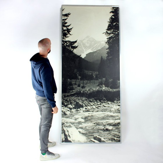 È stampata su un'enorme scala (233 cm di altezza e 101 cm di larghezza). La fotografia è stampata sulla carta, fissata alla struttura in legno e al compensato sottostante. È molto stabile e ben realizzata. La struttura in legno è rifinita con una cornice in alluminio che la circonda. L'opera è appesa a due ganci fissati sul retro. Questo la rende davvero facile da appendere ovunque. Un bellissimo e raro ritrovamento vintage. L'opera è in ottime condizioni vintage, con solo lievi segni di usura. Non presenta strappi o danni.