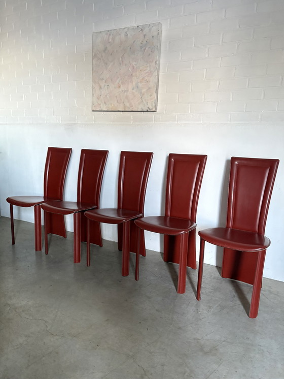 Sedia a forma di sedia laterale. In un ricco color rosso cuoio. Cuciture strette e precise. Telaio in acciaio nero. Tasche in pelle per le maniche che si infilano sulle gambe. Prodotto in Italia.