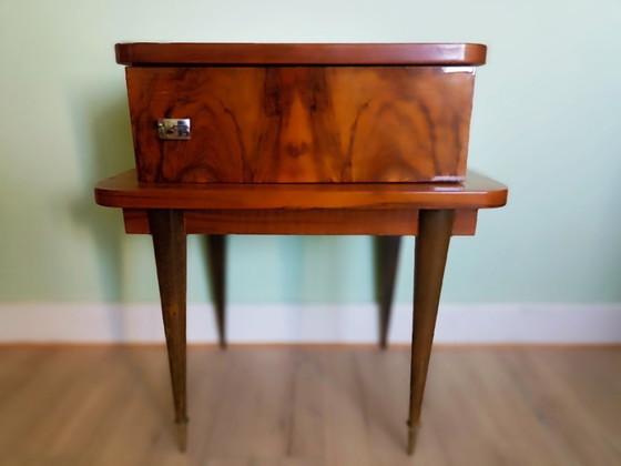 Dit meubeltje is een prachtig en uiterst zeldzaam, authentiek item uit de Franse wederopbouwperiode , afkomstig uit ZW-Frankrijk en een prachtig voorbeeld van de overgang naar het moderne naoorlogs design. Schitterend "bookmatched" fineer op het deurtje zorgt voor een rustige maar luxe symmetrie. Op de achterzijde staat het originele fabrieksstempel 47.032.001B , waarbij 47 suggereert naar het jaar 1947 en B naar Bouleau (Berk)
