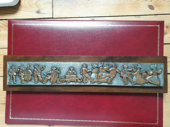 Raro fregio in tre metalli: rame, ottone e metallo argentato, raffigurante una festa di paese.