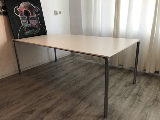 Vi presentiamo il tavolo Plano di Fritz Hansen, un capolavoro di design moderno che fonde perfettamente forma e funzionalità. Questo elegante tavolo, realizzato con precisione, offre un'elegante superficie bianca completata da robuste gambe in metallo argentato, rendendolo un'aggiunta versatile a qualsiasi sala da pranzo contemporanea.
