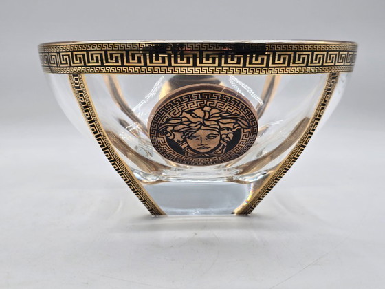 Grande ciotola di cristallo d'epoca a pareti spesse con decoro Medusa e cerchi a meandro degli anni '70/80.