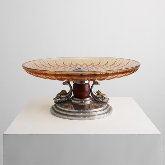Una straordinaria fruttiera Art Déco francese risalente al 1940 circa, che mette in mostra l'eleganza e la maestria artigianale dell'epoca. Il piatto basso in vetro ambrato presenta un raffinato motivo a spirale che cattura magnificamente la luce. Poggia su una base decorata composta da pesci scolpiti color argento, una colonna centrale in legno lucidato e una montatura circolare in metallo a gradini, una squisita combinazione di materiali tipica del lusso Art Déco.