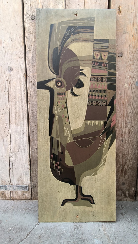 Pannello in legno vintage con illustrazioni stilizzate di galli in stile Mid-Century Modern. Questi tipi di design erano popolari negli anni '50 e '60 e venivano spesso creati da artisti come Shag o ispirati all'arte popolare scandinava o dell'Europa orientale. Potrebbero provenire dalla Germania Ovest, dalla Danimarca o da altri paesi con una forte tradizione di design di quel periodo. Vedere le foto per eventuali danni, come graffi e scheggiature.