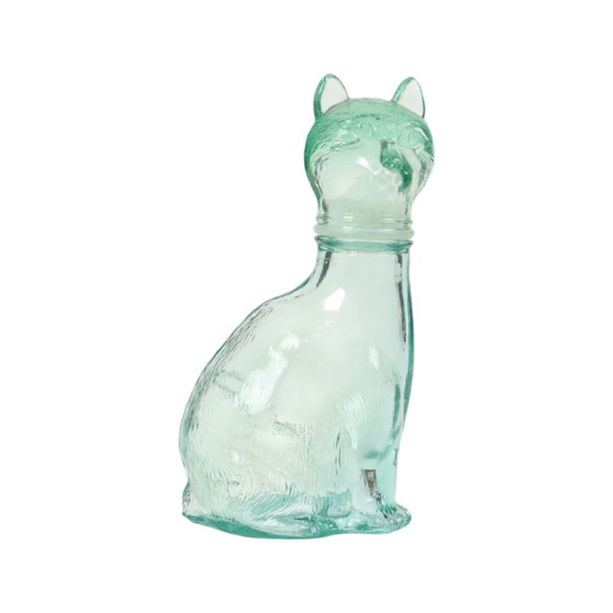 Decanter per gatti in vetro d'epoca, bottiglia da liquore a forma di gatto di colore azzurro, prodotto dalla Vetreria Etrusca, circa anni Sessanta.