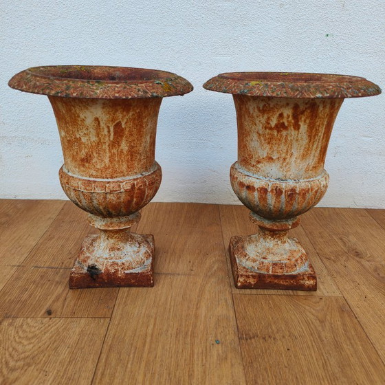 Set van 2 Vintage Franse tuinvazen. Deze plantenvazen zijn gemaakt van ijzer en hebben een prachtige patina. Zet er een mooie plant in en je hebt een eye catcher in je tuin.