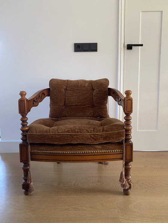 Fate un salto indietro nel tempo con questa squisita poltrona vintage Gioretti, un vero esempio di design classico e artigianalità. Le intense tonalità marroni del morbido rivestimento in tessuto si abbinano splendidamente alla struttura in legno finemente intagliata, offrendo comfort ed eleganza a qualsiasi spazio abitativo. Realizzata con legno di alta qualità e morbido tessuto, garantisce resistenza e comfort. Il design vintage presenta eleganti intagli e dettagli a nappe, che aggiungono un tocco di raffinatezza. Perfetta per chi apprezza pezzi senza tempo che si fondono perfettamente con interni sia tradizionali che moderni. Questa poltrona è la scelta ideale per chi desidera aggiungere un tocco di storia alla propria casa. Richiedete oggi stesso per renderla vostra.