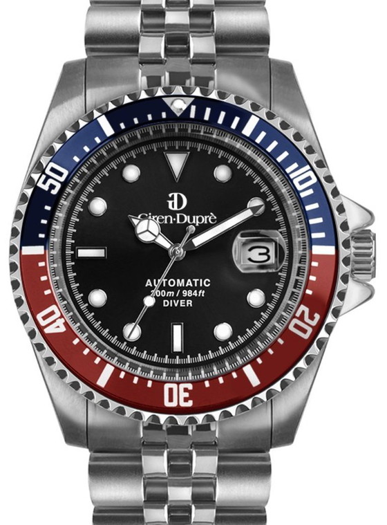 Orologio Giren Dupre, modello Subacqueo Diver 44, cassa in acciaio 44 mm diametro, vetro zaffiro, movimento automatico Seiko NH35, bracciale in acciaio con 5 file di maglie e chiusura di sicurezza deployante. Ghiera girevole 120 scatti unidirezionale con inserto in alluminio bicolore ( Rosso e Blu ), con scala minuti.
