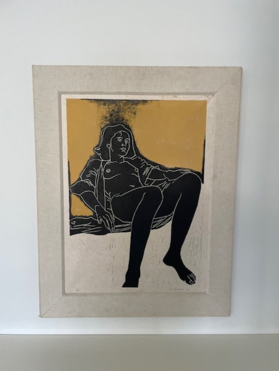 Un'opera grafica unica dell'artista olandese Jan Boetzkes, intitolata "The Morning After", creata nel 1981. Questa litografia espressiva presenta linee potenti e grezze su uno sfondo giallo ocra, conferendo all'opera un forte impatto visivo ed emotivo.