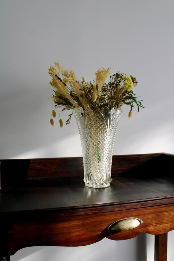 Superbe grand vase en cristal taillé, au design élégant et intemporel. Travail soigné, avec un motif à pointes de diamant et des bords ondulés très décoratifs.