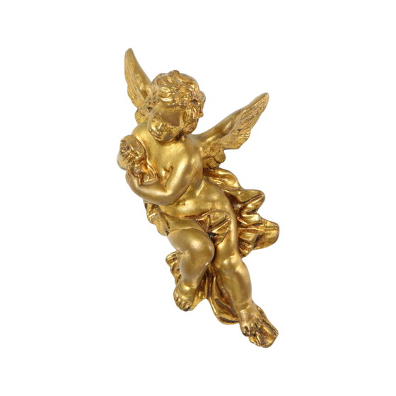 Splendida grande decorazione murale in oro, statua di un angelo, putto o cherubino in rilievo, realizzata in gesso dorato, seconda metà del XX secolo, circa 1970. Bellissima statua di un angelo classico, rara in queste grandi dimensioni; di solito sono molto più piccole. In ottime condizioni vintage, una piccola macchia sul ginocchio, segni del tempo e dell'usura coerenti con l'età, nessuna parte mancante, vedere le foto per maggiori dettagli! Dimensioni: 19x10x30 cm. Peso: 0,681 kg.