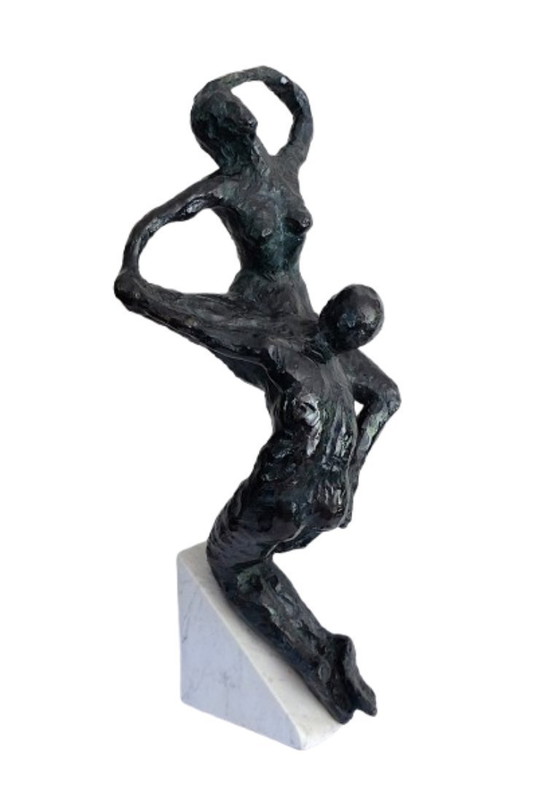 Importante bronzo di LE BRIS Charles, nato nel 1932. Gruppo in bronzo "La Passione" con patina verde sfumata, fusione n°1/8, su base in marmo bianco venato di grigio. Firmato LE BRIS e marchio del fondatore due volte sulla base. Altezza 90,5 cm x 39 x 30 cm, circa 1970/80.