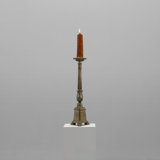 Grande candeliere da chiesa o da altare in rame con base decorata a forma di treppiede, poggiante su tre piedi di leone. La base è decorata con il cuore sacro, angeli e altre rappresentazioni religiose. Il fusto scanalato è decorato con creste e foglie d'acanto.