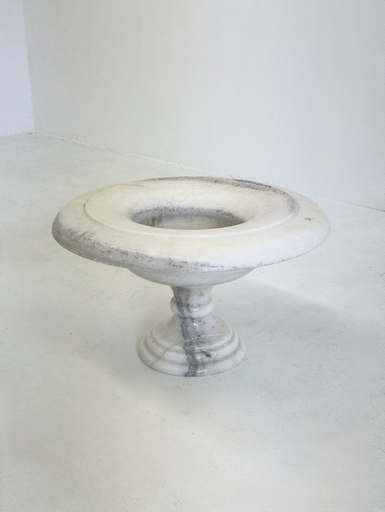 Ciotola o vaso vintage in marmo bianco. Grazie al suo peso e alla sua forma, è perfetto come oggetto decorativo, vaso per fiori o per piante. Il design emana un'atmosfera classica da giardino italiano o francese e si adatta sia agli interni che agli esterni.