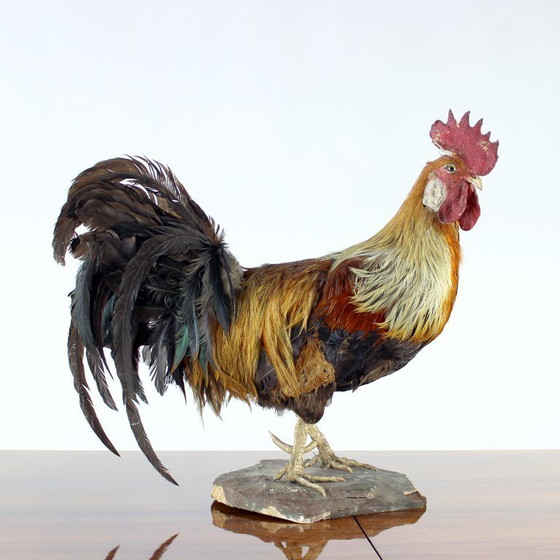 Questo straordinario pezzo di tassidermia antica proviene dalla Germania e risale ai primi anni del 1900. È caratterizzato da un gallo montato a corpo intero, presentato in piedi su una solida base di legno. La base è contrassegnata sul fondo dal timbro originale del preparatore, che ne accresce l'autenticità e il valore collezionistico.