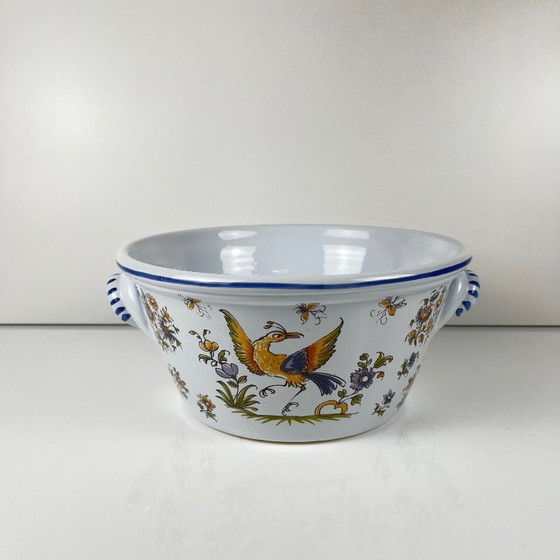 Grande insalatiera in terracotta dipinta a mano, firmata "Moustiers" sul retro, XX secolo