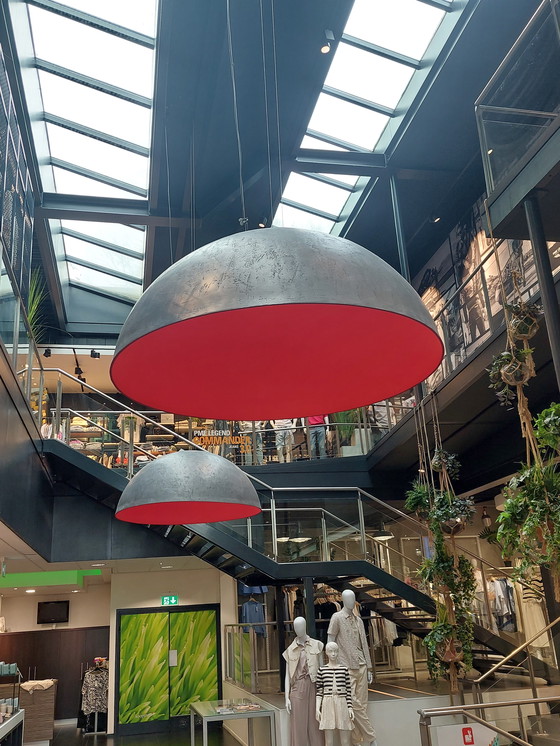 Questa grande lampada a sospensione industriale kunst0offen di Kunstlicht è un vero e proprio richiamo per qualsiasi interno. Con la sua robusta finitura metallica in grigio e l'interno rosso, questa lampada conferisce un aspetto unico agli spazi moderni e industriali. La lampada combina stile e funzionalità ed è in buone condizioni. Ideale per chi cerca un pezzo di illuminazione resistente e contemporaneo.