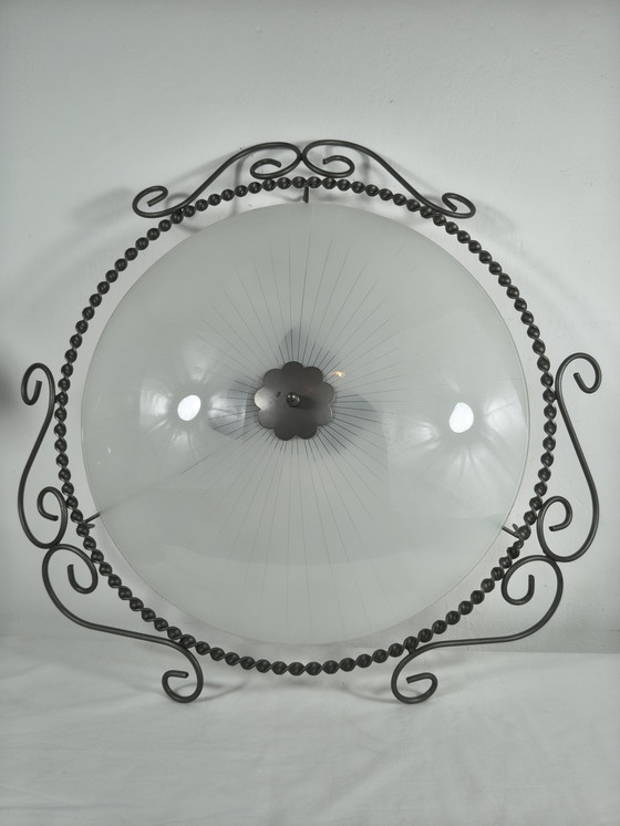 Grande lampada da parete/plafoniera vintage Art Déco in ferro battuto e vetro satinato – Ø49 cm