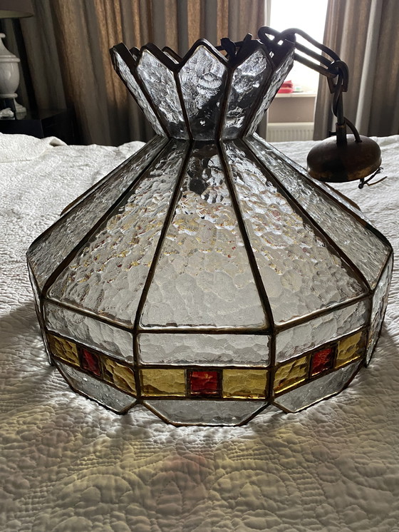 Bellissima, grande e pesante lampada da soffitto in vetro Poliarte originale italiana degli anni '60. Realizzata in Italia durante il periodo d'oro degli anni '60. Vetro martellato trasparente. Montatura in ottone. Un vetro è rotto. Per il resto, in ottime condizioni.