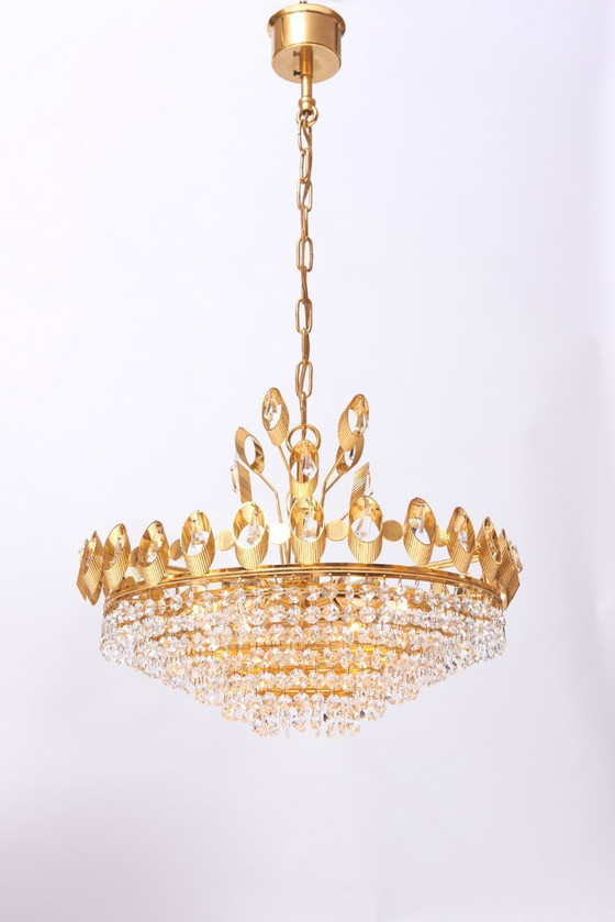 Immagina questo splendido lampadario Palwa appeso nel tuo soggiorno, che diffonde una luce calda e invitante. Realizzato in pregiato ottone e impreziosito da scintillanti cristalli di vetro, questo pezzo è un vero e proprio colpo d'occhio.