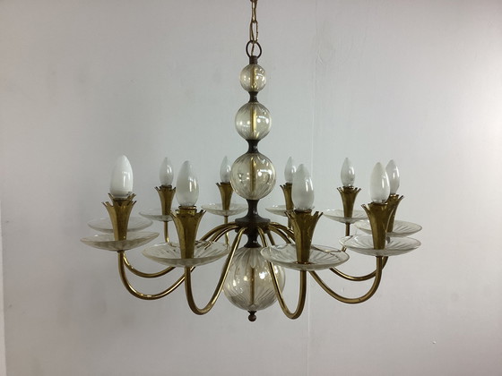 Grande lampadario vintage Chandolier degli anni Cinquanta in vetro e rame