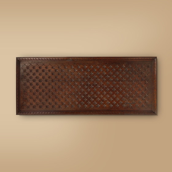 Portogallo / 1850 / Pannelli da parete / Quercia / Neogotico Un grande pannello antico in quercia, intagliato su entrambi i lati, realizzato a mano in Portogallo. Risalente al 1850 circa, questo pannello in quercia presenta eccezionali motivi geometrici e una cornice neogotici intagliati a mano. Il legno di quercia scura ha una finitura liscia e gradevole con una leggera patina, che conferisce al pannello carattere e fascino. Questo pezzo eccezionale è stato restaurato professionalmente. Questo pannello unico e raro fonde perfettamente l'estetica moderna con il fascino naturale. Può essere posizionato orizzontalmente e verticalmente come decorazione murale o come divisorio. Il tipico motivo geometrico gotico intagliato si adatta perfettamente a qualsiasi stile d'interni, mentre la finitura scura e liscia mette in risalto le venature naturali del legno, rendendolo un capolavoro unico nel suo genere.