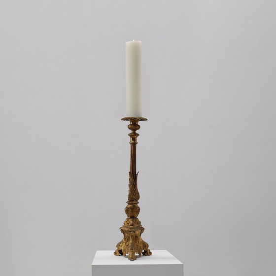 Grande candeliere da chiesa o da altare in rame e bronzo con base tripode decorata, poggiante su tre piedi arricciati. Questo cero del XVIII secolo è stato fuso in parti. La base è decorata con Maria, Gesù e Jozef e angeli sovrastanti. Il fusto scanalato è decorato con creste e foglie d'acanto.