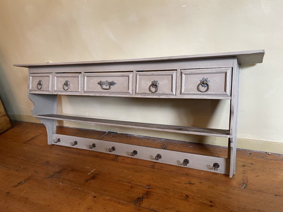 Un bellissimo e sorprendente scaffale da parete con contenitori dalla Francia. Super carino e molto pratico per rallegrare la tua cucina. Lo scaffale ha quattro cassetti piccoli e uno grande al centro. I cassetti hanno maniglie in metallo. C'è anche un ripiano sottostante. Il colore è grigio chiaro. Larghezza: 135,5 cm. Profondità: 25 cm. Altezza totale: 57 cm.