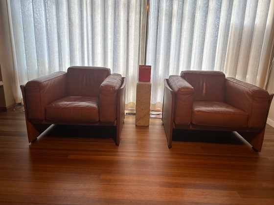 Questa esclusiva coppia di poltrone "405 Duc" presenta un'innovativa struttura a pannelli, assemblati senza soluzione di continuità con una cerniera a tutta altezza lungo i lati. Progettati per offrire un comfort eccezionale e la sostenibilità ambientale, i cuscini offrono un'esperienza di seduta lussuosa. Da quando Cassina ha interrotto la produzione di questo specifico modello con i cuscini laterali, sono diventati un'aggiunta rara e ricercata a qualsiasi interno sofisticato.