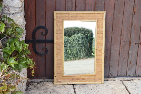 Specchio rettangolare in bambù e rattan in stile bohémien. Vintage anni '60/'70. Prodotto dal marchio italiano Dal Vera, rinomato per la sua cornice in bambù e l'impiallacciatura in rattan intrecciato. Mobile e complemento d'arredo di alta qualità. Imballato con cura.