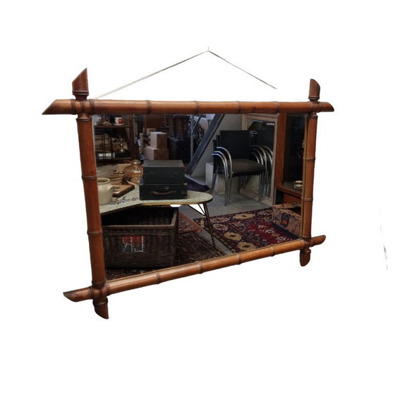 Grande specchio vintage in finto bambù, Francia, anni '50/'70. Specchio decorativo in legno, da appendere alla parete in orizzontale, con carattere. Presenta lievi danni dovuti al tempo, come mostrato in foto.