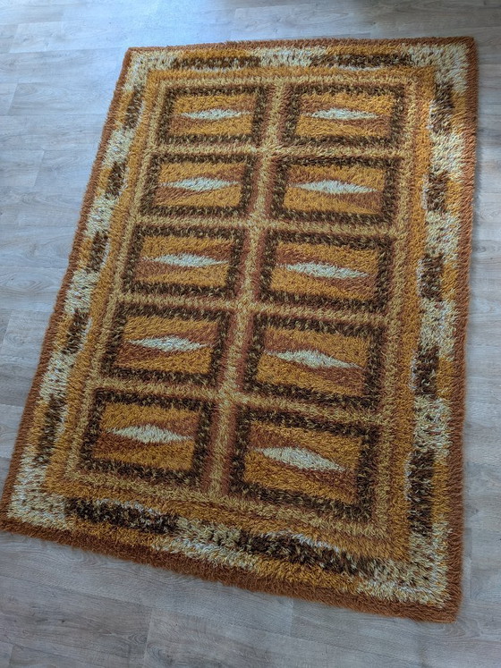 Splendido e autentico tappeto Rya a pelo lungo degli anni '70, caratterizzato da un classico motivo geometrico a griglia "Space Age". Proveniente dalla Francia, questo pezzo cattura perfettamente l'estetica audace dell'era Eames con le sue vivaci tonalità terrose di arancio bruciato, giallo senape e marrone cioccolato intenso.