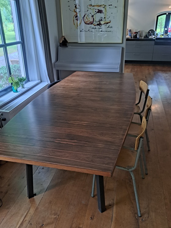 Questo grande tavolo da pranzo vintage della metà del secolo scorso ha un bellissimo piano in palissandro dalla forma ringiovanita o a botte.