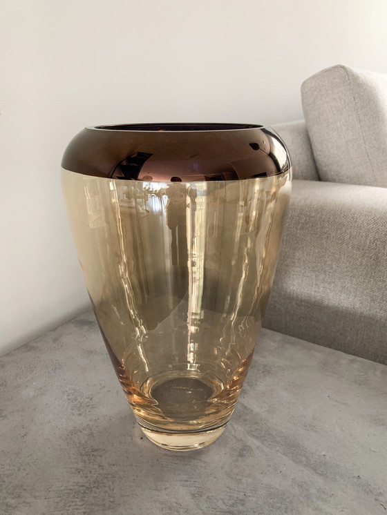 Bellissimo vaso, realizzato in vetro color ambra. Fatto a mano (anelli girevoli, base ispessita). Bel design, con un bordo dipinto di rosso-marrone nella parte superiore. Bellissima combinazione di colori 👌🏼 Nell'ultima foto, si vede un bordo superiore leggermente sbiadito. Era già così al momento dell'acquisto. Non ci sono danni, probabilmente dovuti alla natura artigianale del vaso. Altezza 35 cm. Diametro 20 cm (misurato nella parte superiore). Acquistato in un negozio di fiori e piante. Marca sconosciuta.