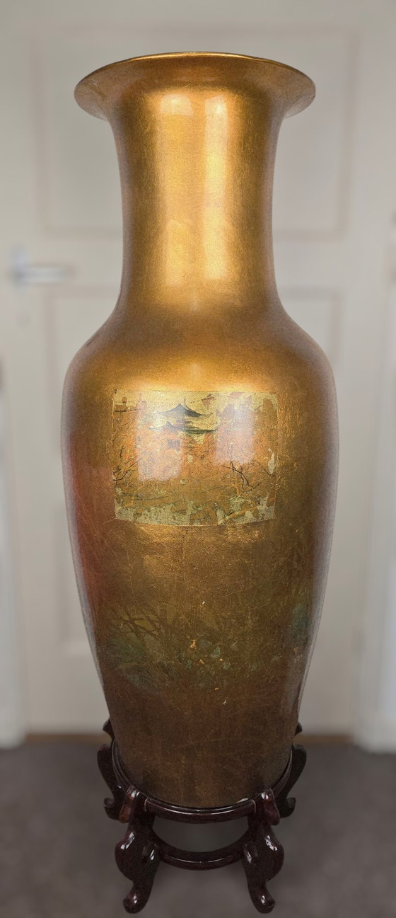 Bellissimo vaso cinese dorato di grandi dimensioni con decorazione dipinta a mano.